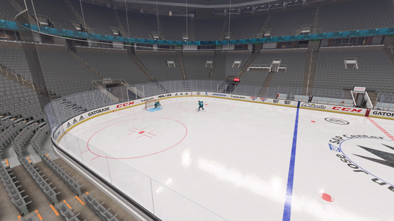 The Blues swapped out all color in the lower bowl for all neutral colors. Black seats, gray walls, and a gray canopy up by the rafters. If you see blue in the bowl aside from the hockey boards, it it was all painted over with neutral colors. The scoreboard could use some work too. Most of the newer scoreboards EA has added are pretty accurate but the Blues board looks kind of off. It should be a little taller and the rinks should be a little more curved on the edges to reduce the 'boxy-ness' look. The whole board could be a touch larger and lower to the ice as well. Not a huge thing, but it would certainly make this board look much more like the real thing.